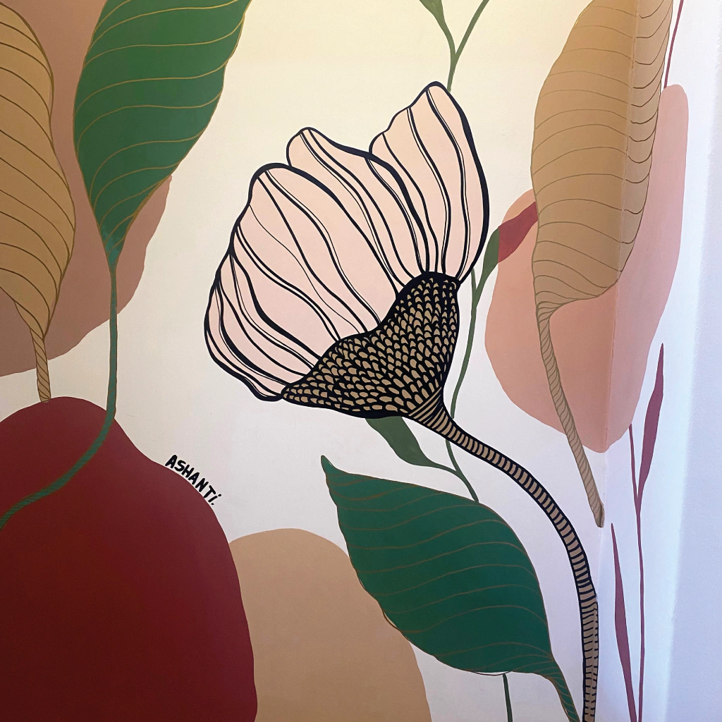 Mural com flores e folhas, nos tins terrosos, para estética Lanna Beauty Spa